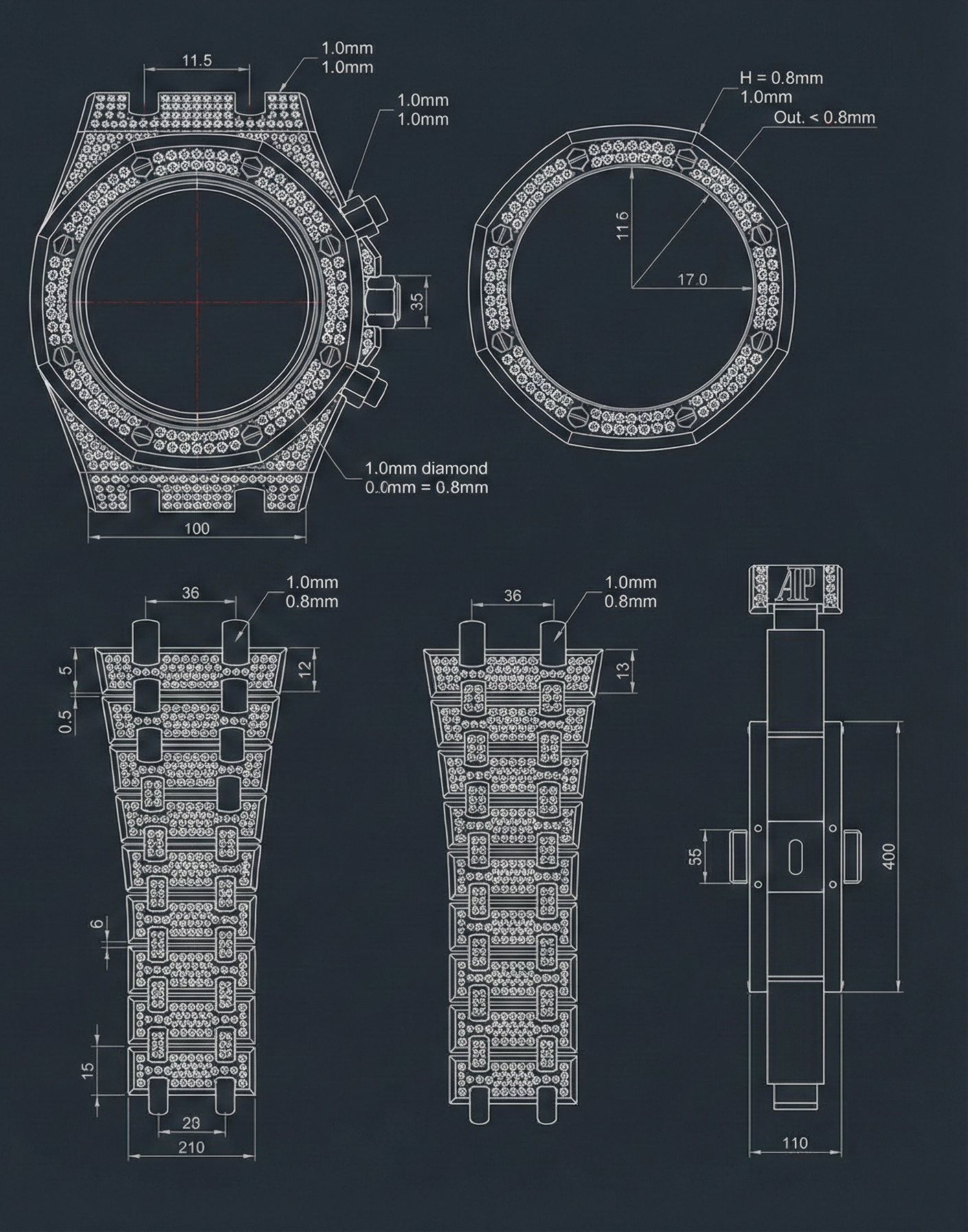 We start with a full Scan of the object, making an accurate plan on where and how is possible to position the stones without compromising the integrity of the watch.