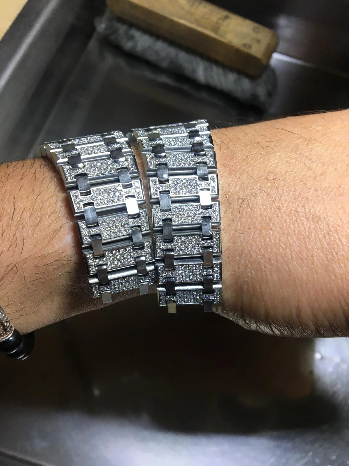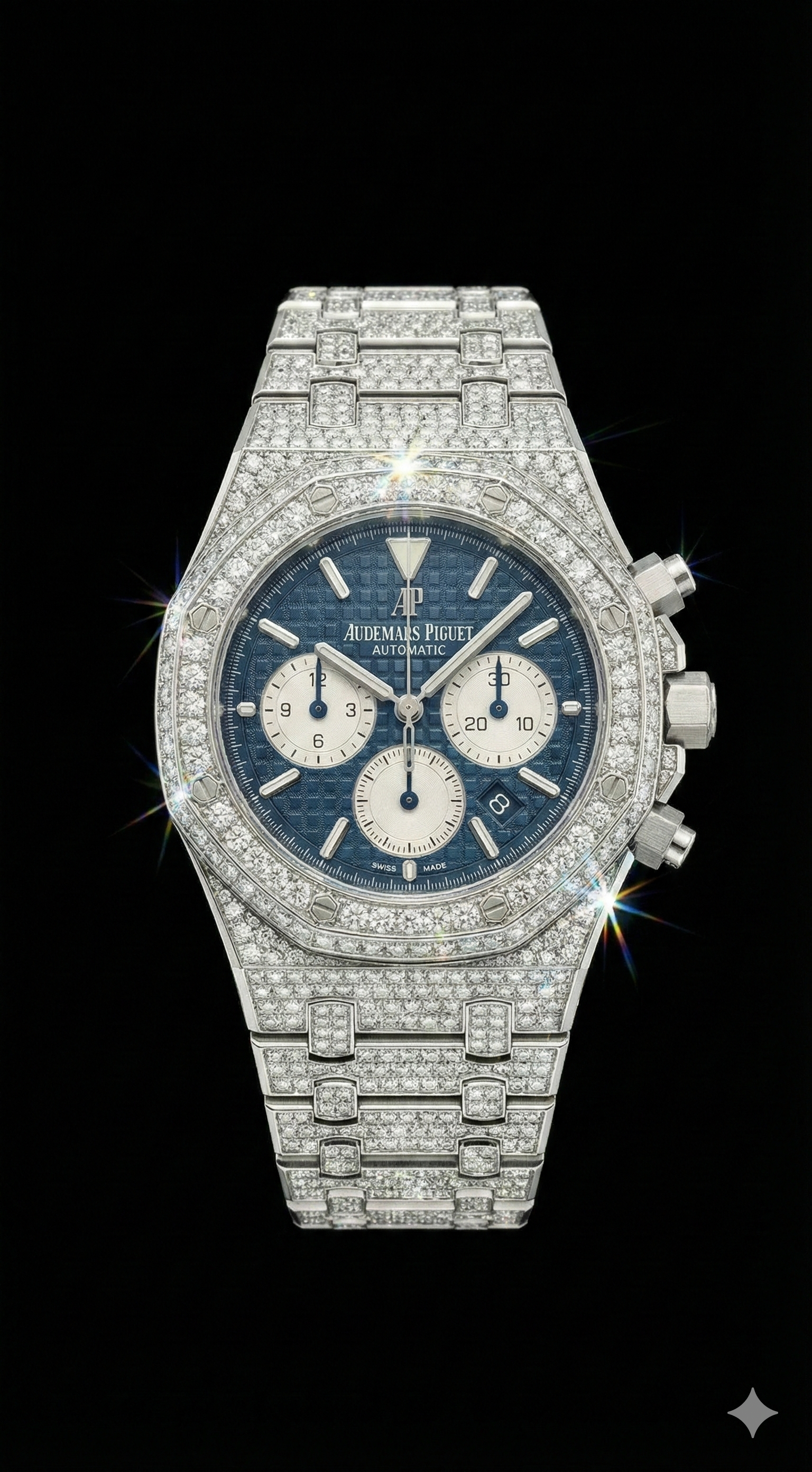 Master goldsmiths meticulously set each stone by hand, one by one. We employ distinct techniques tailored to the specific material of the watch, typically gold or steel."